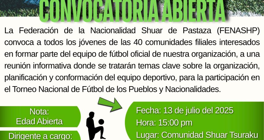La Federación de la Nacionalidad Shuar de Pastaza (FENASHP) convoca a todos los jóvenes de las 40 comunidades filiales interesados en formar parte del equipo de fútbol oficial de nuestra organización, a una reunión informativa donde se tratarán temas clave…