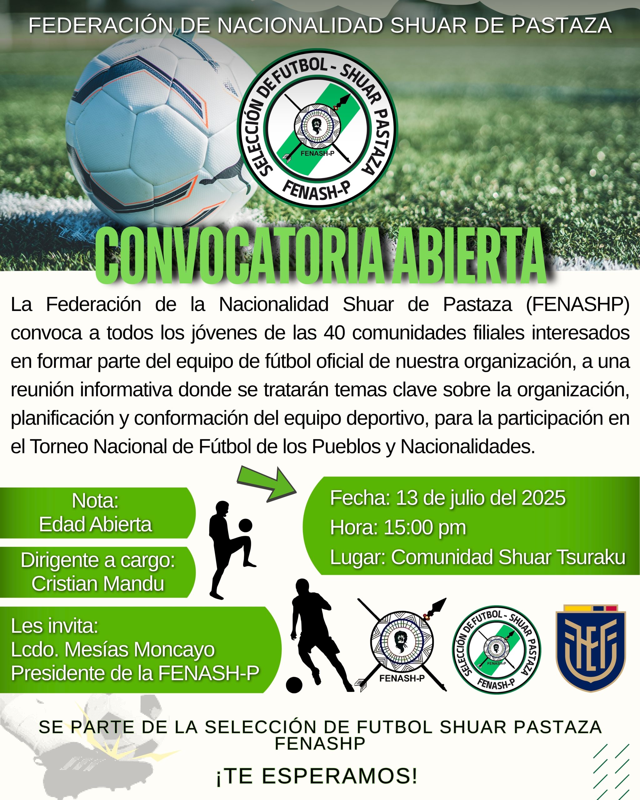 La Federación de la Nacionalidad Shuar de Pastaza (FENASHP) convoca a todos los jóvenes de las 40 comunidades filiales interesados en formar parte del equipo de fútbol oficial de nuestra organización, a una reunión informativa donde se tratarán temas clave sobre la organización, planificación y conformación del equipo deportivo, para la participación en el Torneo Nacional de Fútbol de los Pueblos y Nacionalidades.