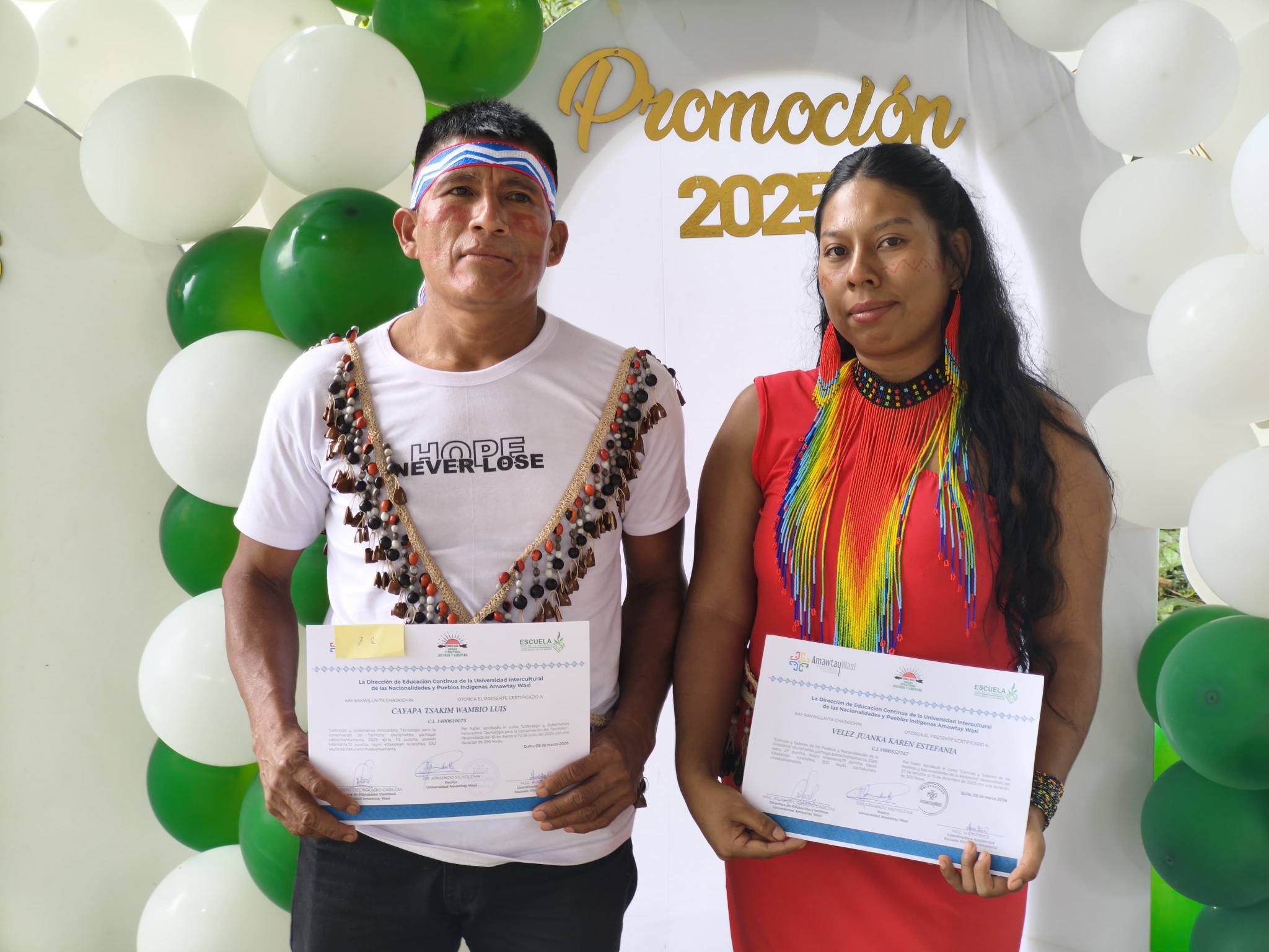 Felicitamos a la Srta. Estefanía Vélez, de la organización ONASHPAE, y al Sr. Luis Kayap, de la organización ETSA, quienes durante su formación adquirieron y fortalecieron conocimientos en liderazgo, gobernanza, defensa del territorio y administración financiera. Estas capacidades les permitirán desempeñar un rol activo dentro de sus comunidades y aportar al fortalecimiento organizativo de la Nacionalidad Shuar de Pastaza.