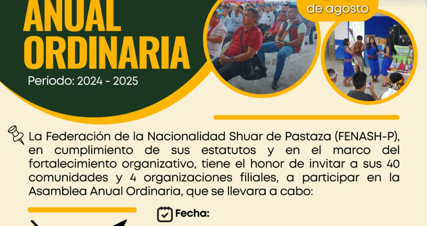 FENASH-P invita a su Primera Asamblea Anual Ordinaria, período 2024 – 2025. Fecha: Sábado, 30 de agosto de 2025 Hora: 09h00 am Lugar: Sede de la FENASH-P – Comunidad Shuar Tsuraku (Km 50, vía Puyo – Macas) La participación de…